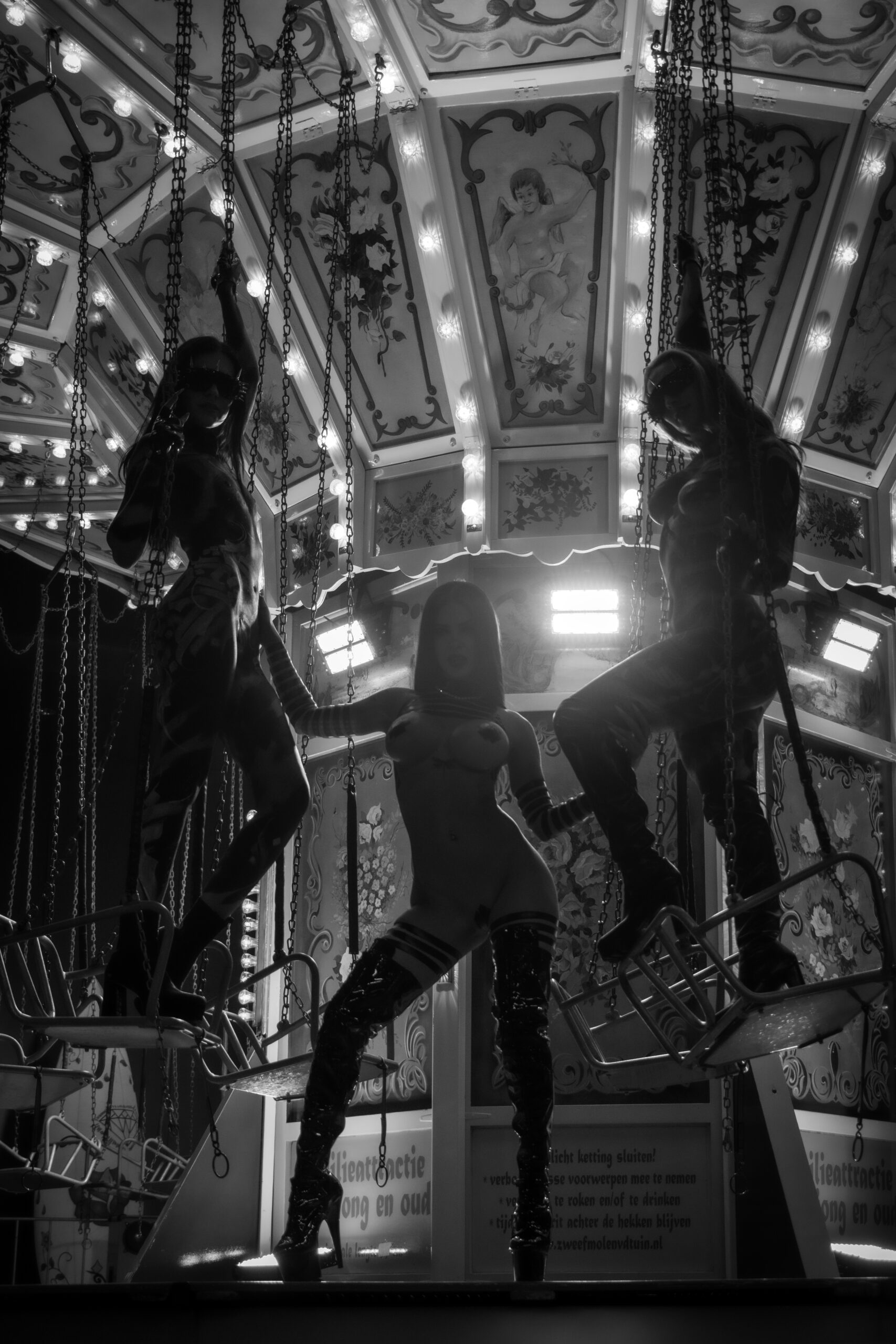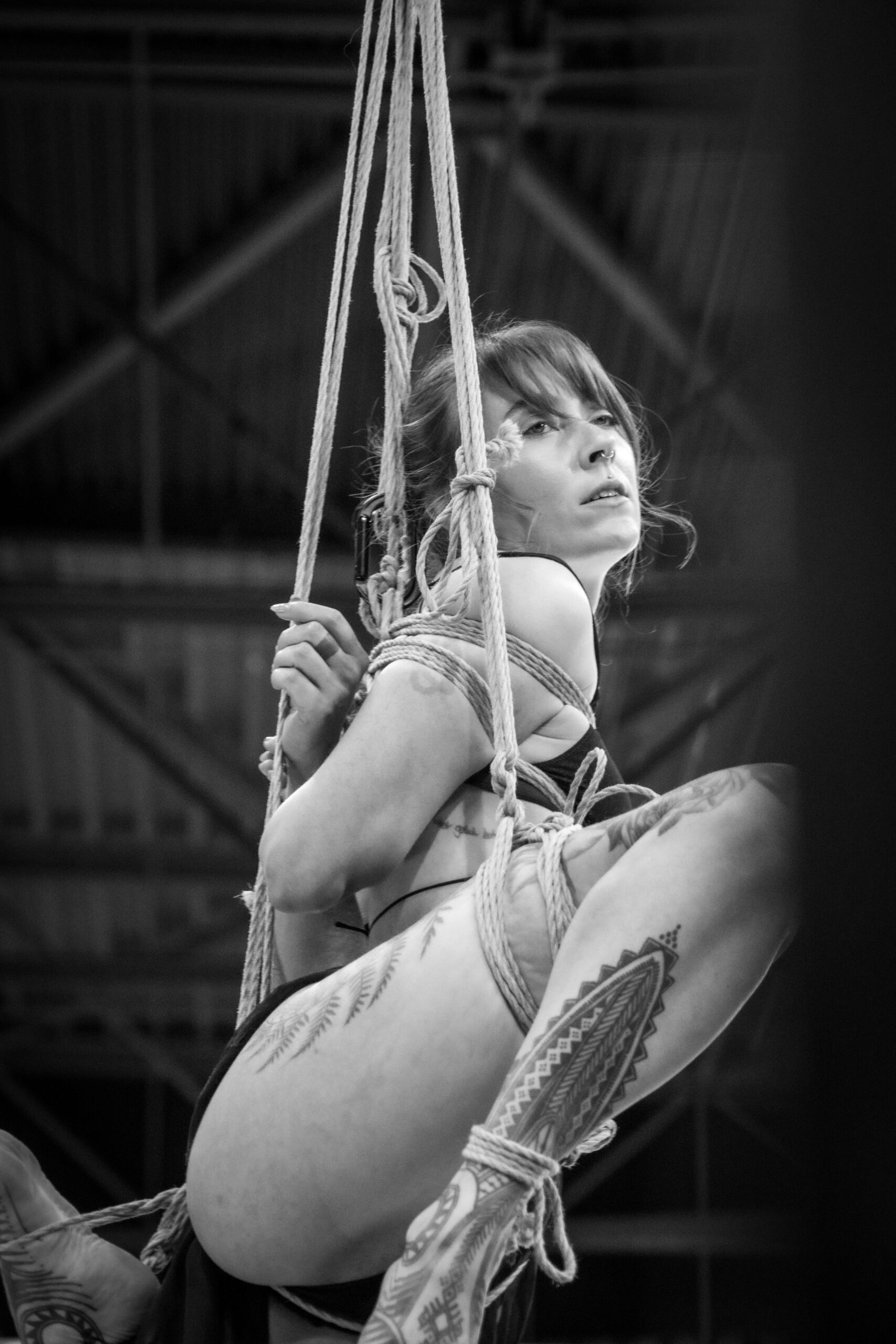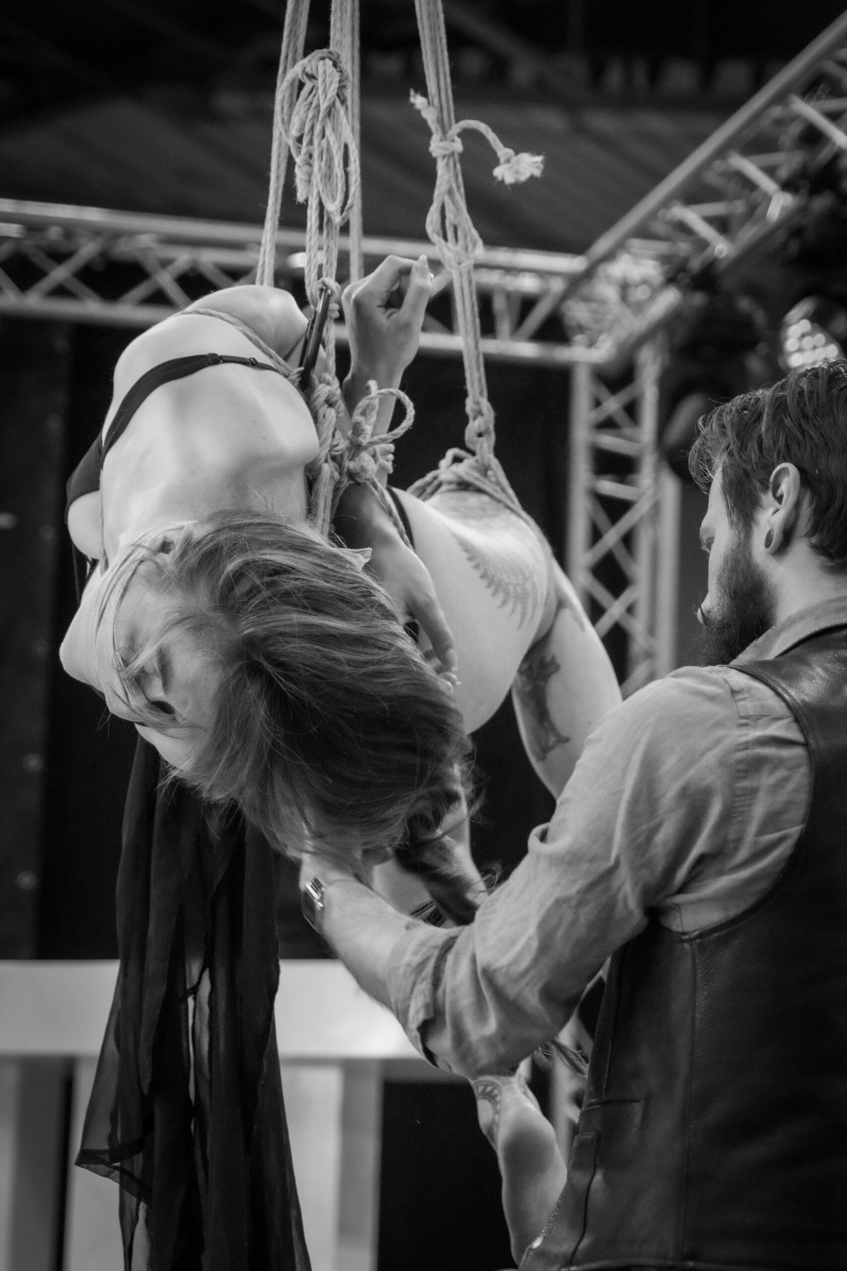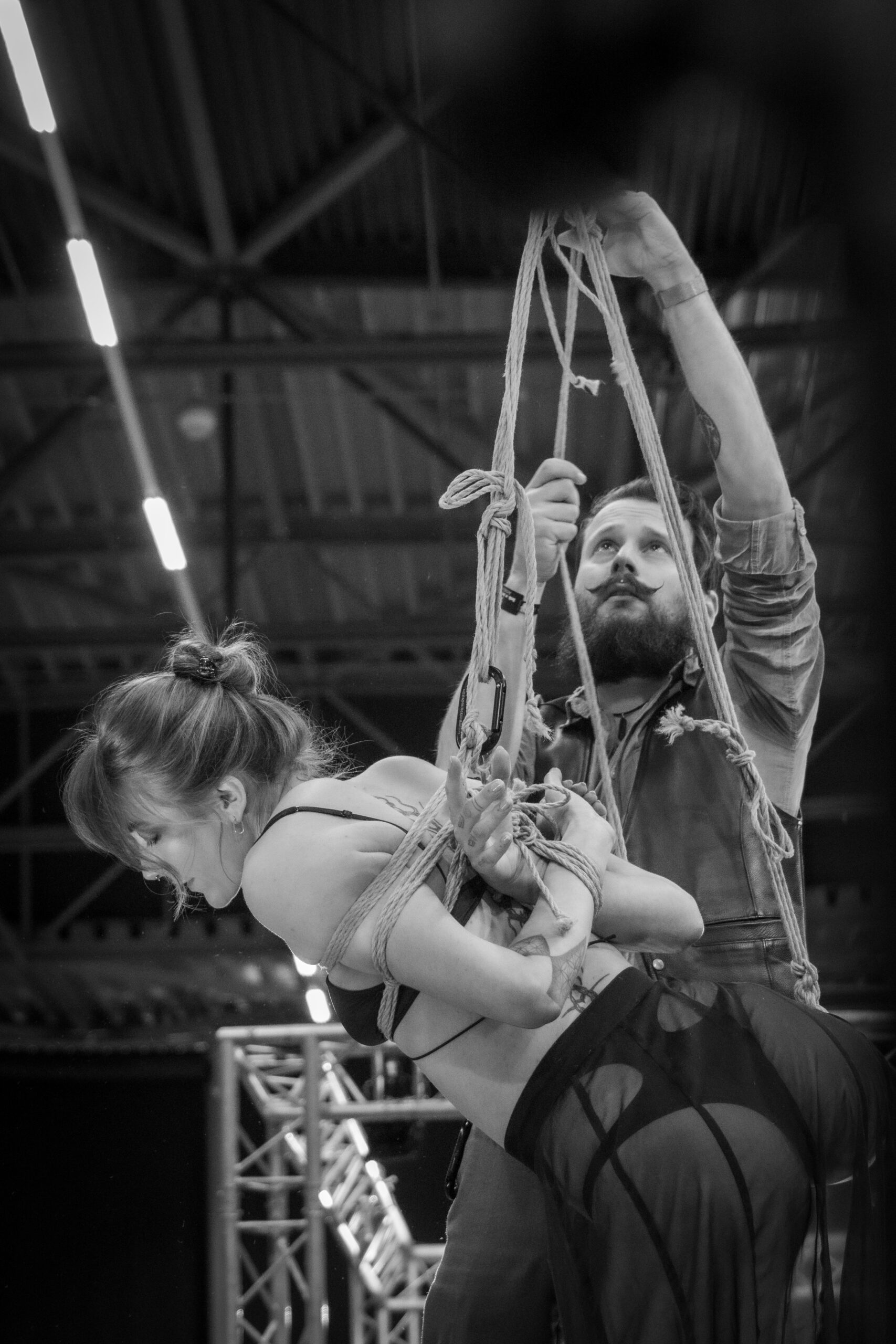 De performance toont de beheersing van Doph Vex, de rigger en de complete overgave van Sick Ducks, het model. Het is een spel van gewicht, zwaartekracht en absolute focus. De touwen accentueren de kracht van het silhouet en maken de kwetsbaarheid zichtbaar.
