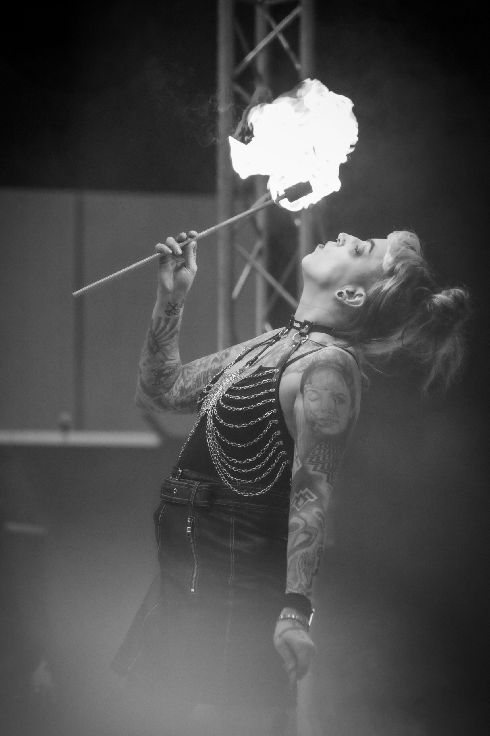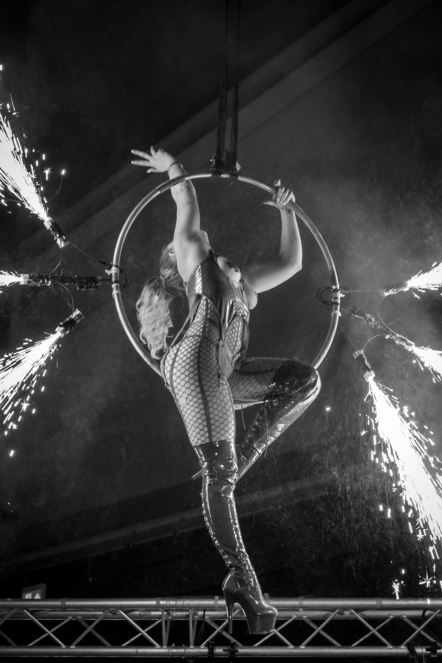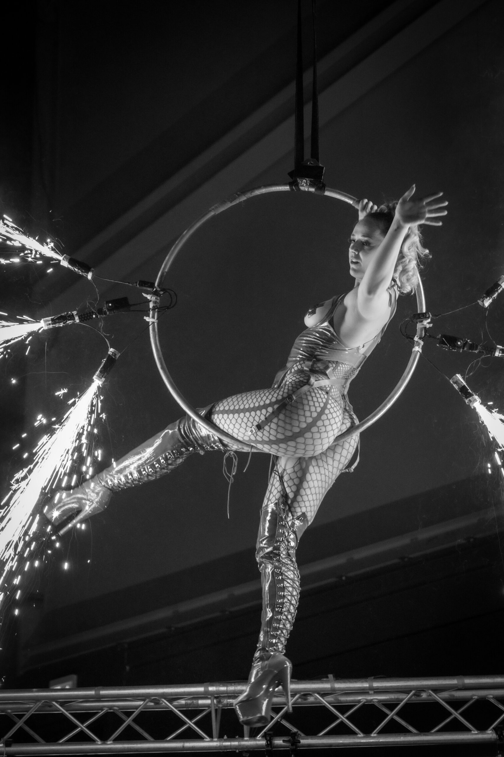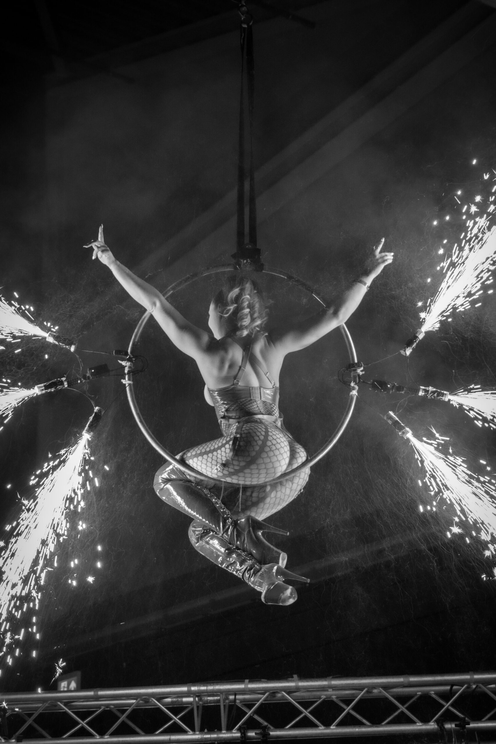 De performance toont de beheersing van Doph Vex, de rigger en de complete overgave van Sick Ducks, het model. Het is een spel van gewicht, zwaartekracht en absolute focus. De touwen accentueren de kracht van het silhouet en maken de kwetsbaarheid zichtbaar.